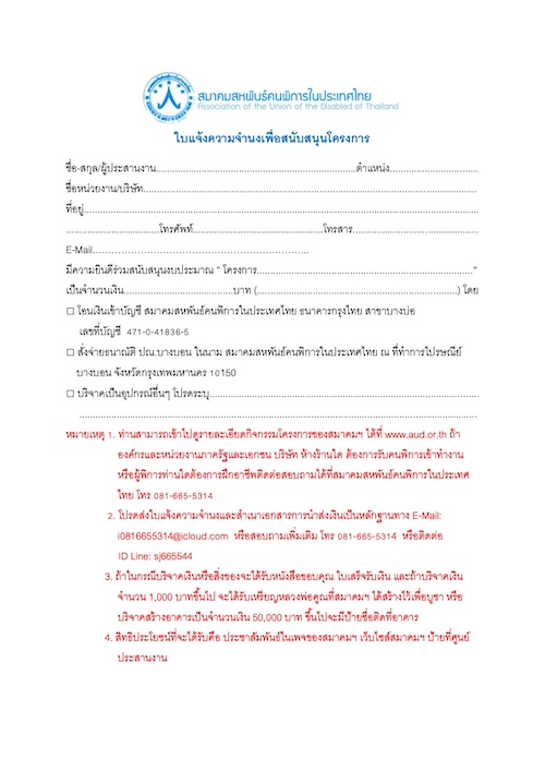 ขอเชิญร่วมสนับสนุนสมาคมสหพันธ์คนพิการในประเทศไทยที่ส่งเสริมให้คนพิการมีงานทำ โดยไม่ต้องเป็นภาระของสังคม สอบถามเพิ่มเติมได้ที่ นายกฯสายแจ้ง โทร.