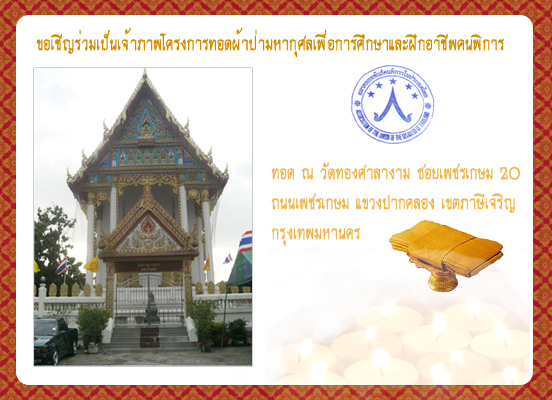 เตรียมจัดงานทอดผ้าป่ามหากุศล ในวันที่ 19 ธันวาคม 2553 ณ วัดทองศาลางาม เขตภาษีเจริญ กรุงเทพฯวิงวอนผู้มีจิตศรัทธาทั่วประเทศร่วมบริจาคทรัพย์ ถือเป็นการทำบุญเฉลิมฉลองในเทศกลาปีใหม่อีกด้วย